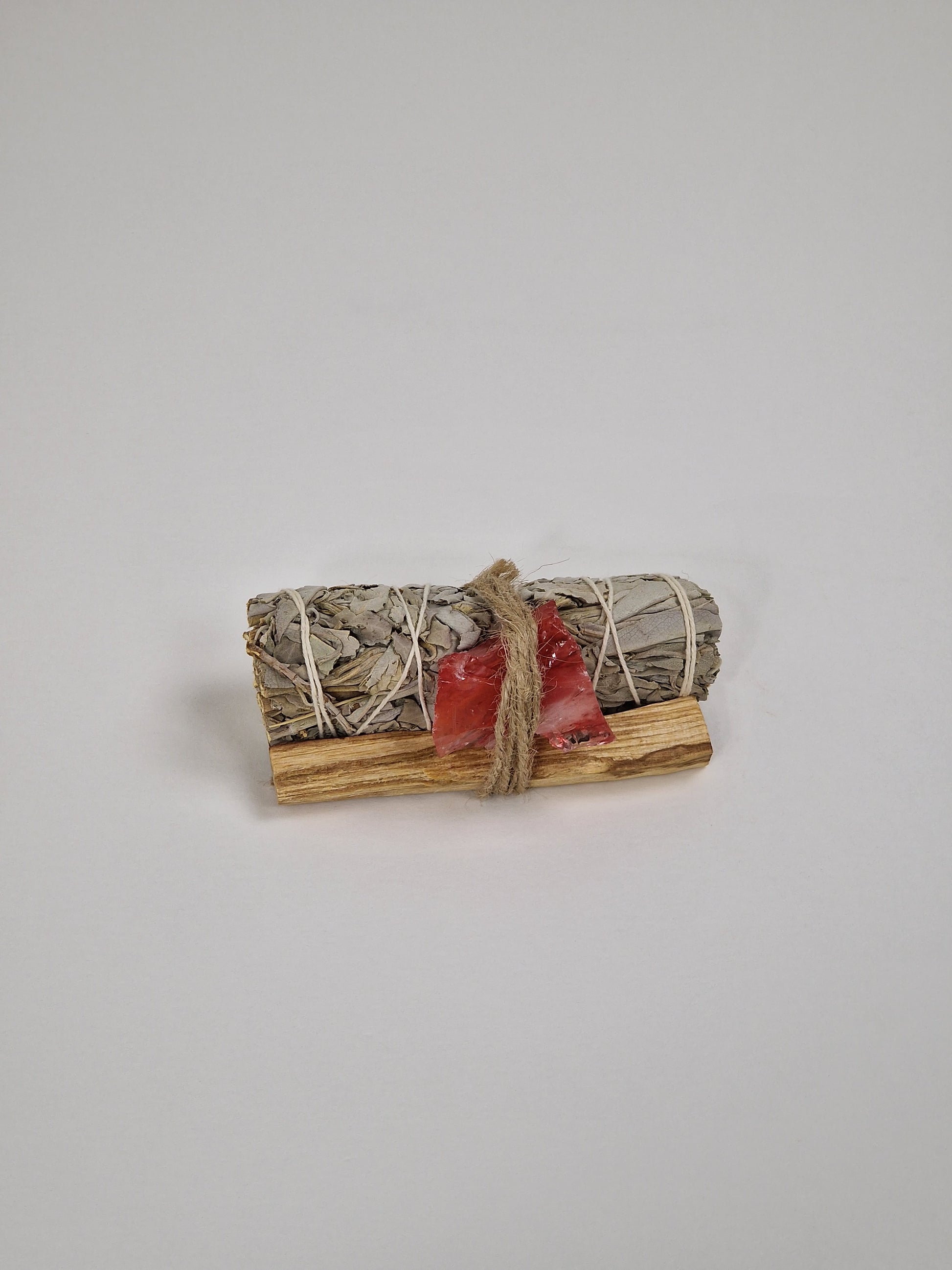 Großes Bündel weißer Salbei, ein Rohkristall-Kirschquart, Kirschquart und ein Stück Palo Santo, heiliges Holz