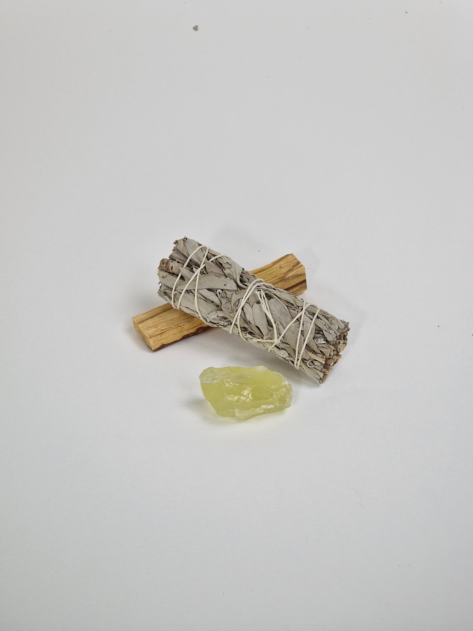 Ein Paket mit einem rohen Citrinkristall, einem großen Bündel Salbei und einem Stück Palo Santo, dem heiligen Holz
