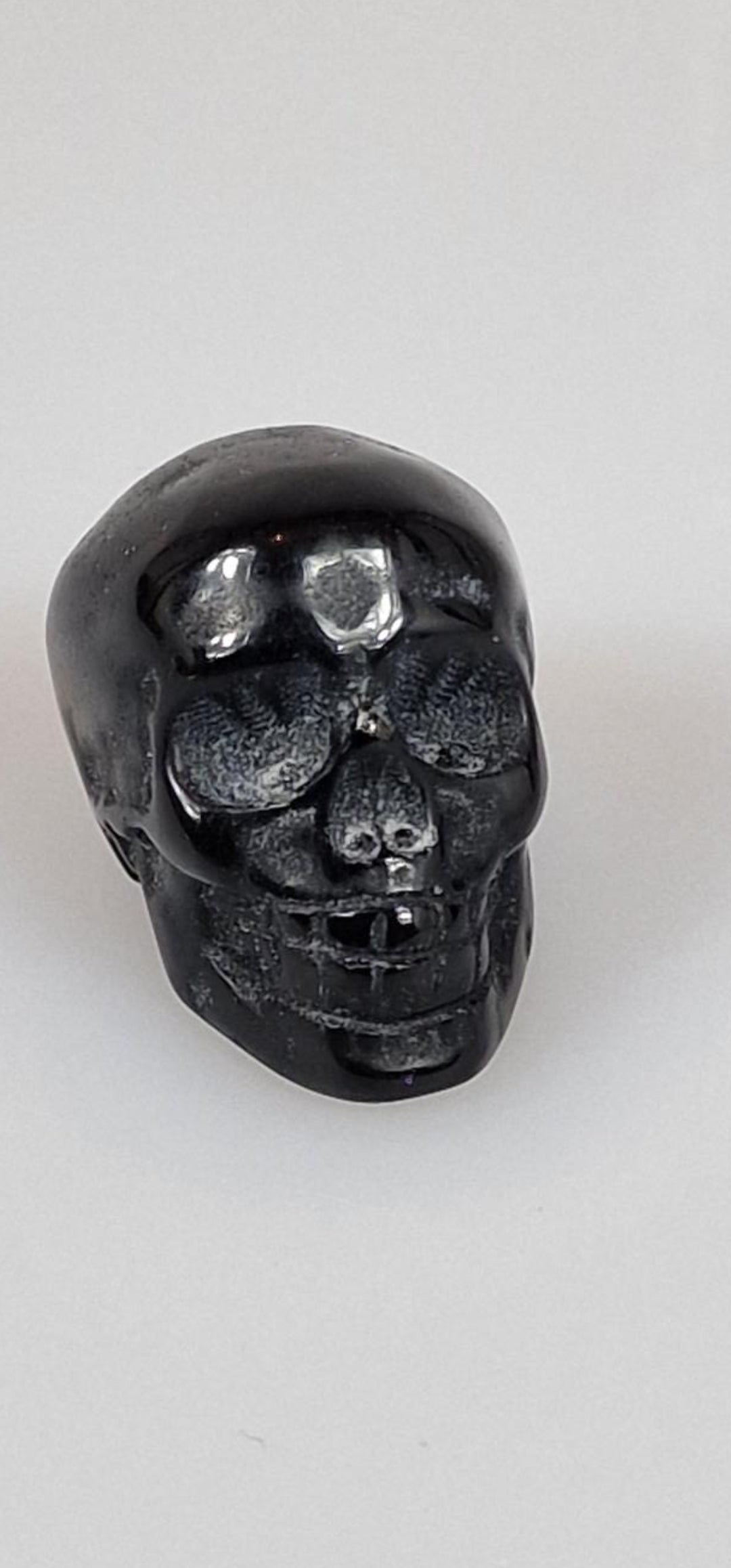 Schwarzer Onyx-Kristallschädel. Totenkopf aus schwarzem Onyx-Edelstein.