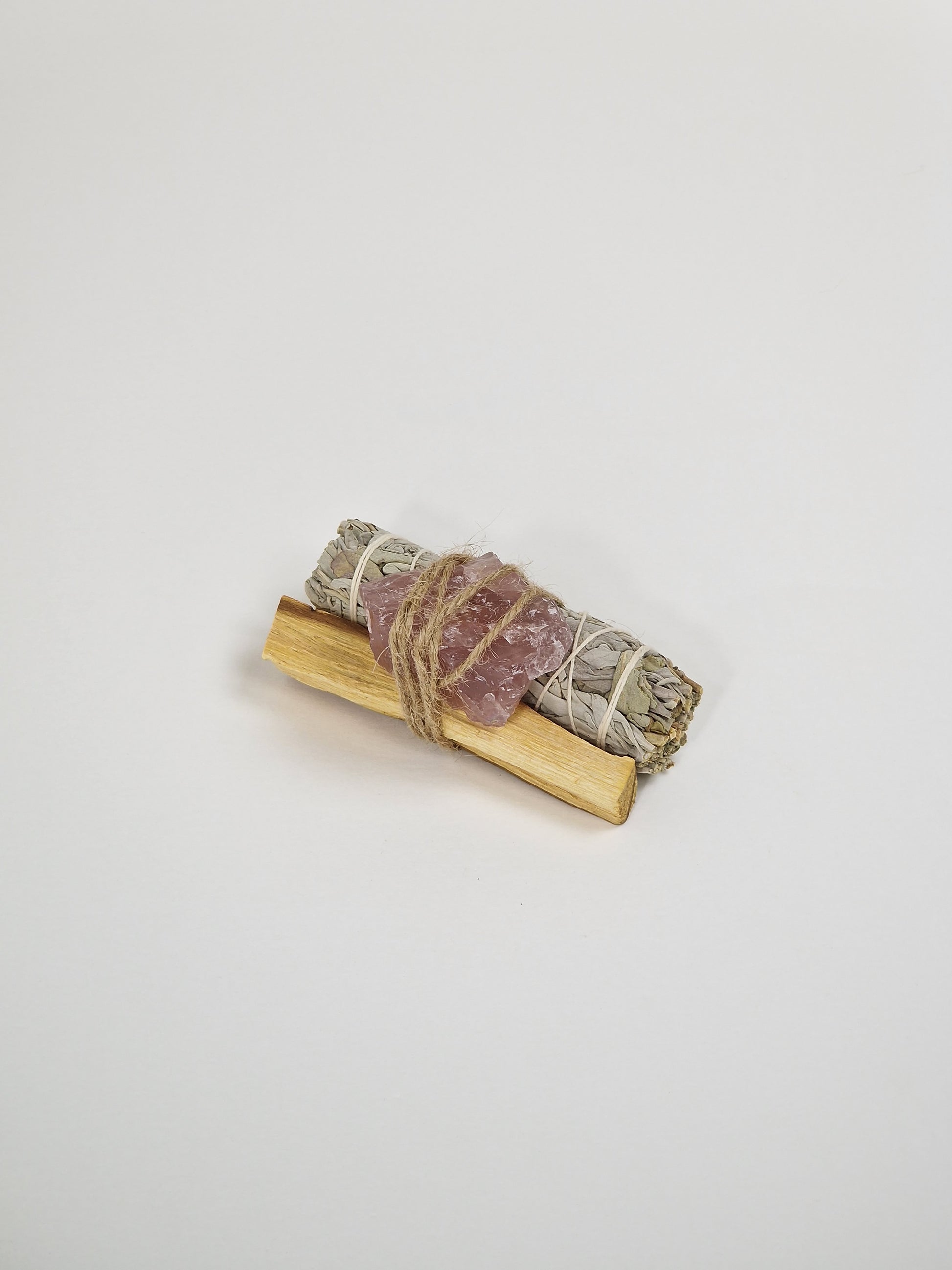 Das Kristallpaket von Dickfashion enthält einen rohen Edelsteinkristall des Kristalls der Liebe, Rosenquarz, einen Räucherstab aus weißem Salbei und einen Holzstab aus Palo Santo, heiligem Holz, von 11 cm.