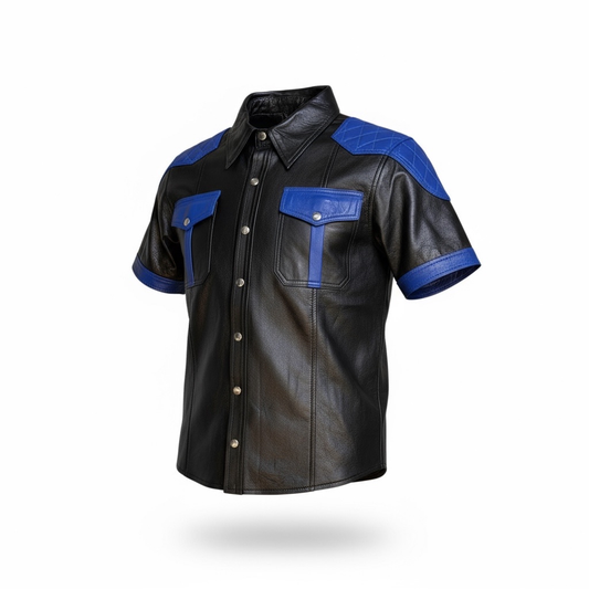 Läderskjorta, skinnskjorta, blå med svarta detaljer
