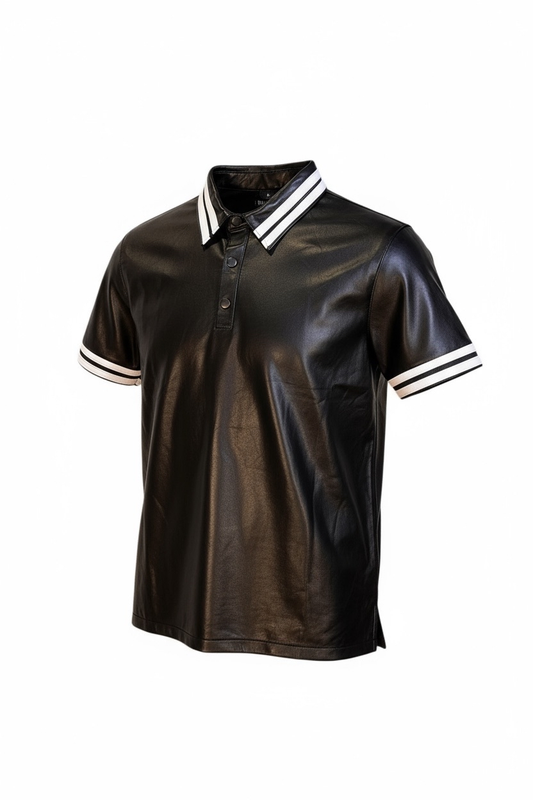 Läderskjorta, skinnskjorta, pikétröja svart med vita detaljer
