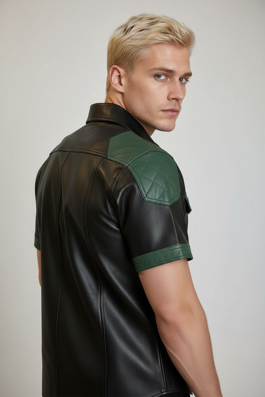 Läderskjorta, skinnskjorta, quiltade axlar, svart med gröna detaljer