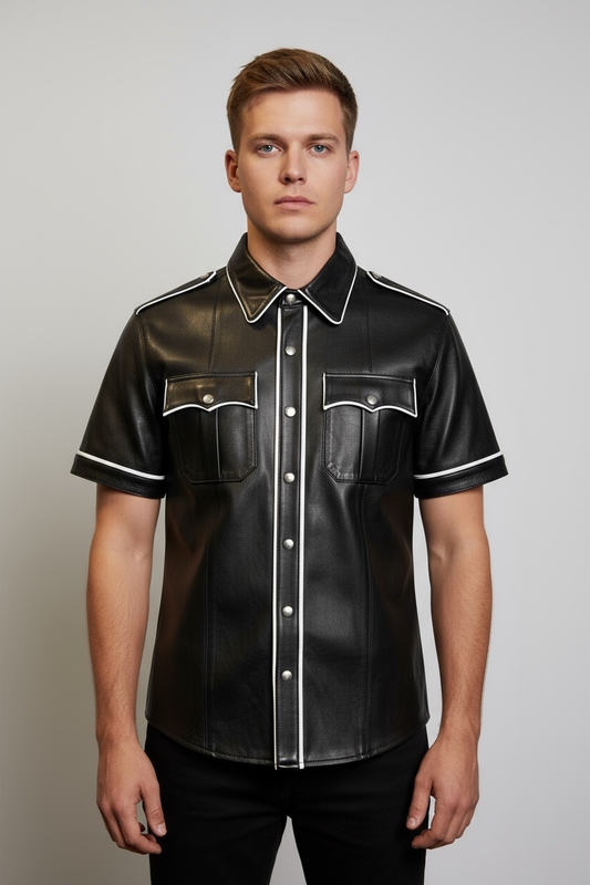 Läderskjorta, skinnskjorta, svart med vita detaljer
