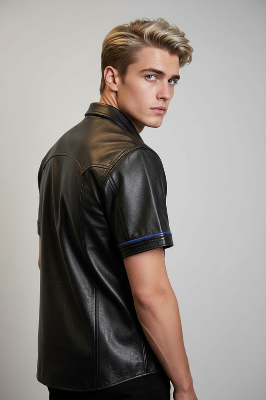 Läderskjorta, skinnskjorta, svart med blå detaljer
