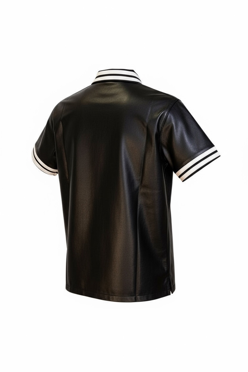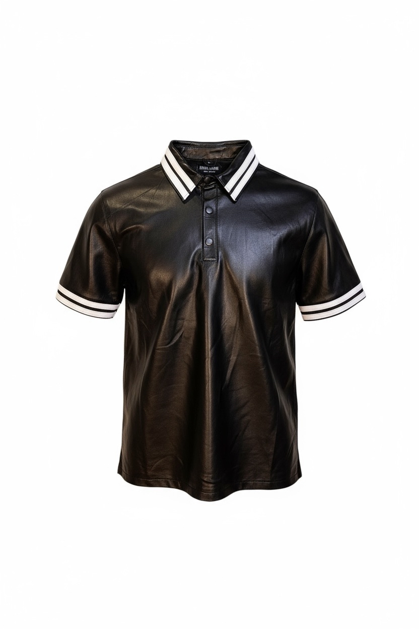 Läderskjorta, skinnskjorta, pikétröja svart med vita detaljer