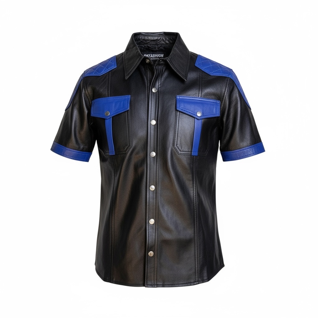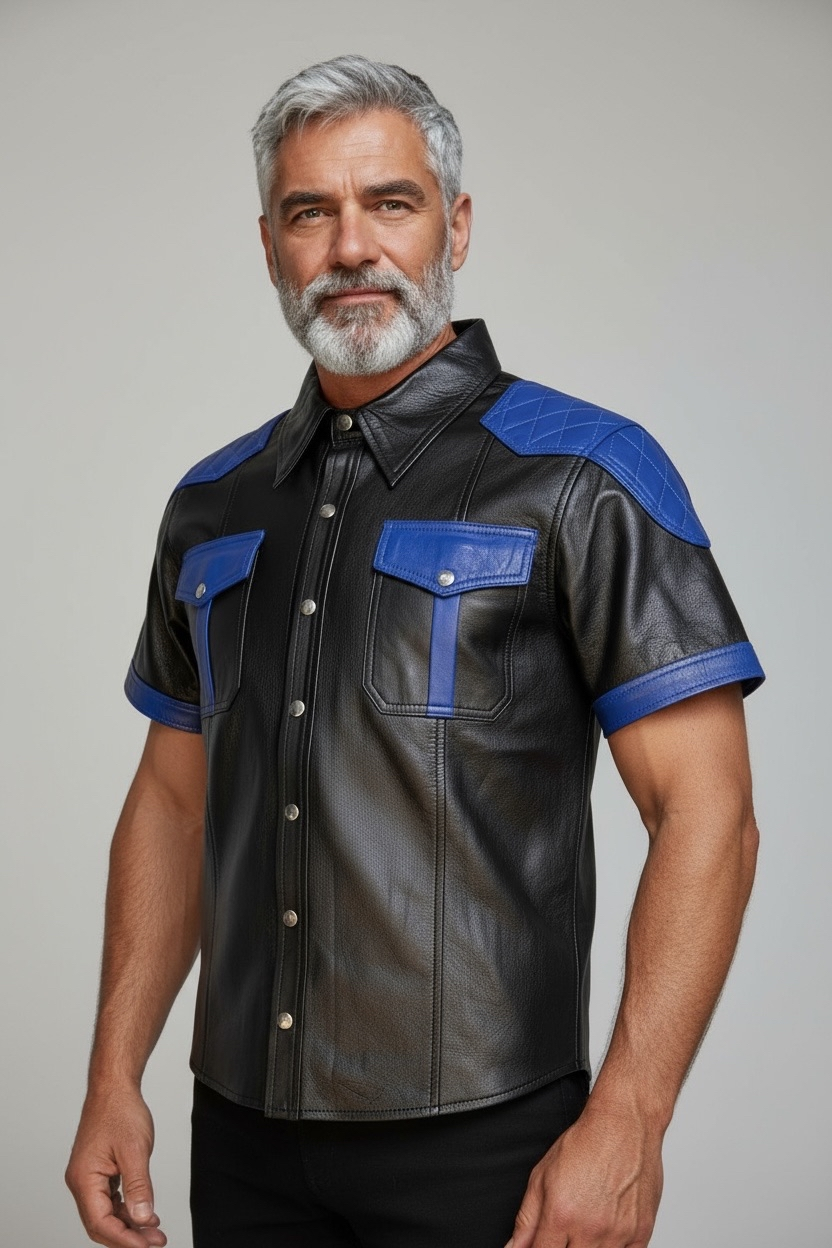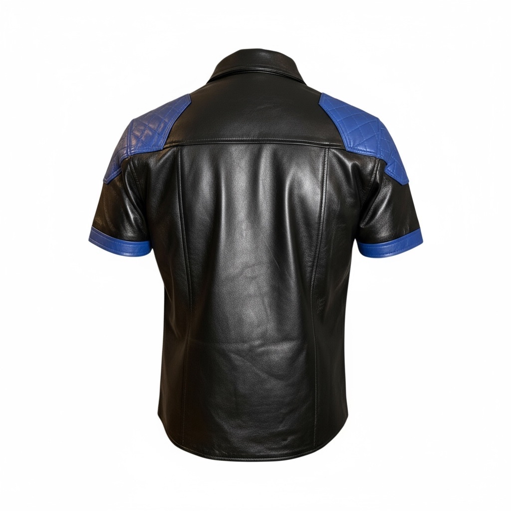 Läderskjorta, skinnskjorta, quiltade axlar, svart med blå detaljer