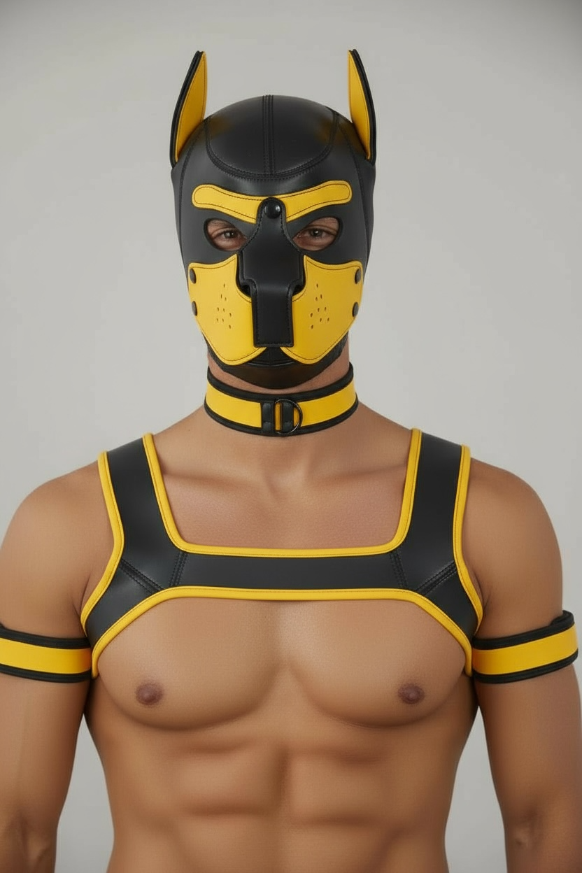 Puppy play harness in neoprene. Stylish harness also for going to a club or as clothes for Halloween. Available in many colors. For puppy play.
