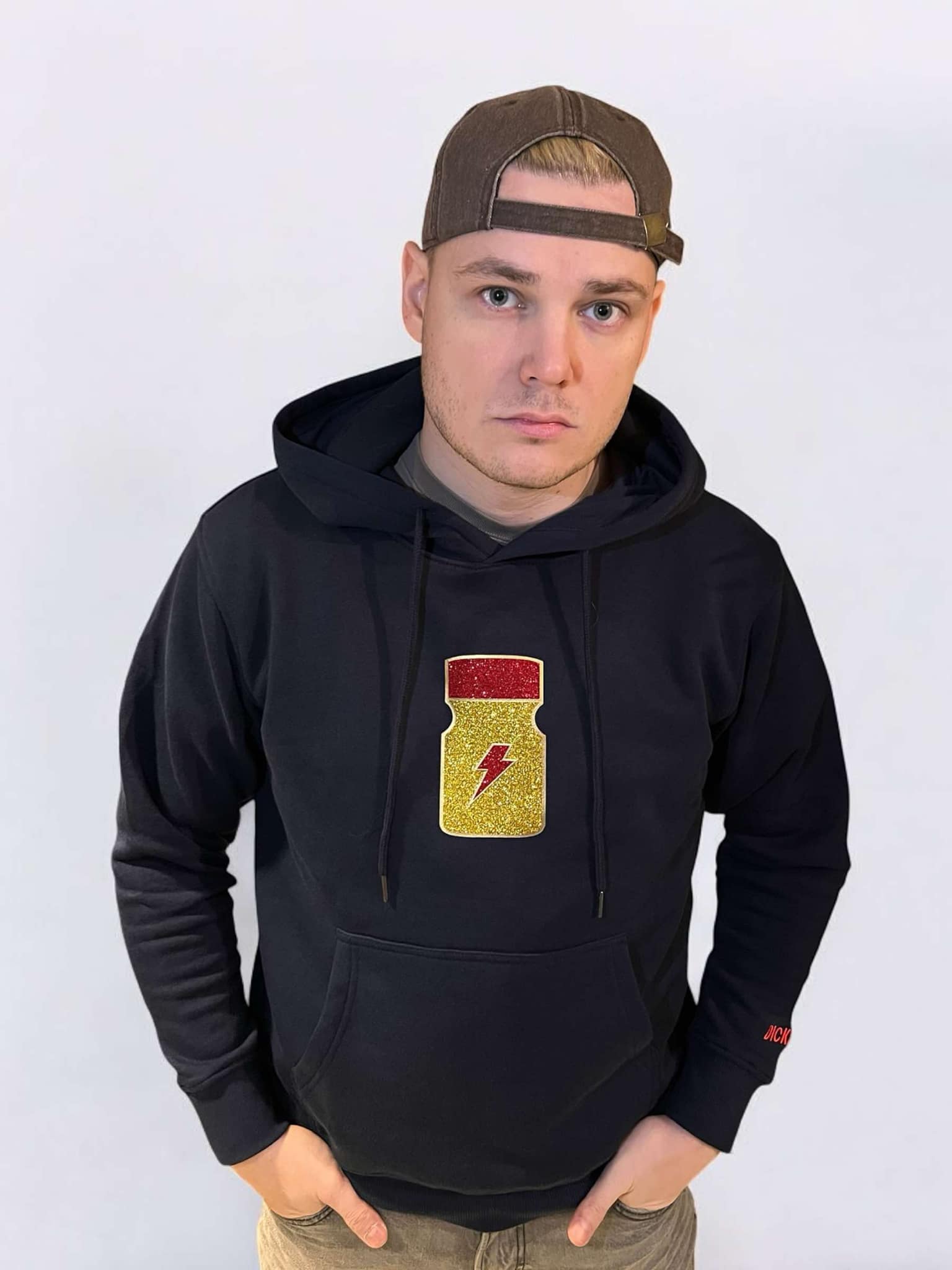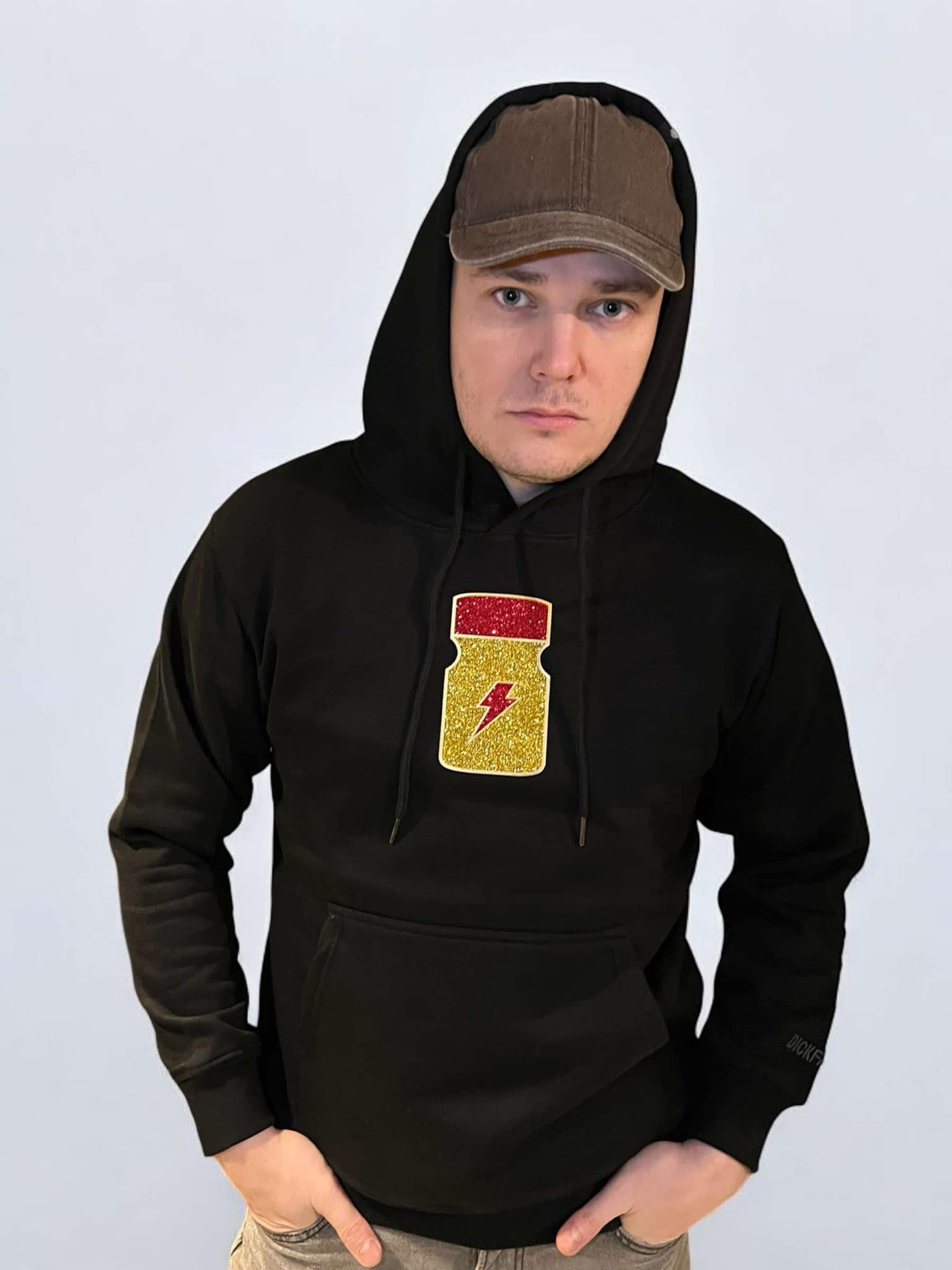 Sudadera con capucha cálida y cómoda de alta y buena calidad. Una sudadera que funciona bien para hombre y mujer. Esta sudadera con capucha tiene un estampado en el pecho en forma de una botella de poppers con brillo. Variante elegante de estampado en ropa.