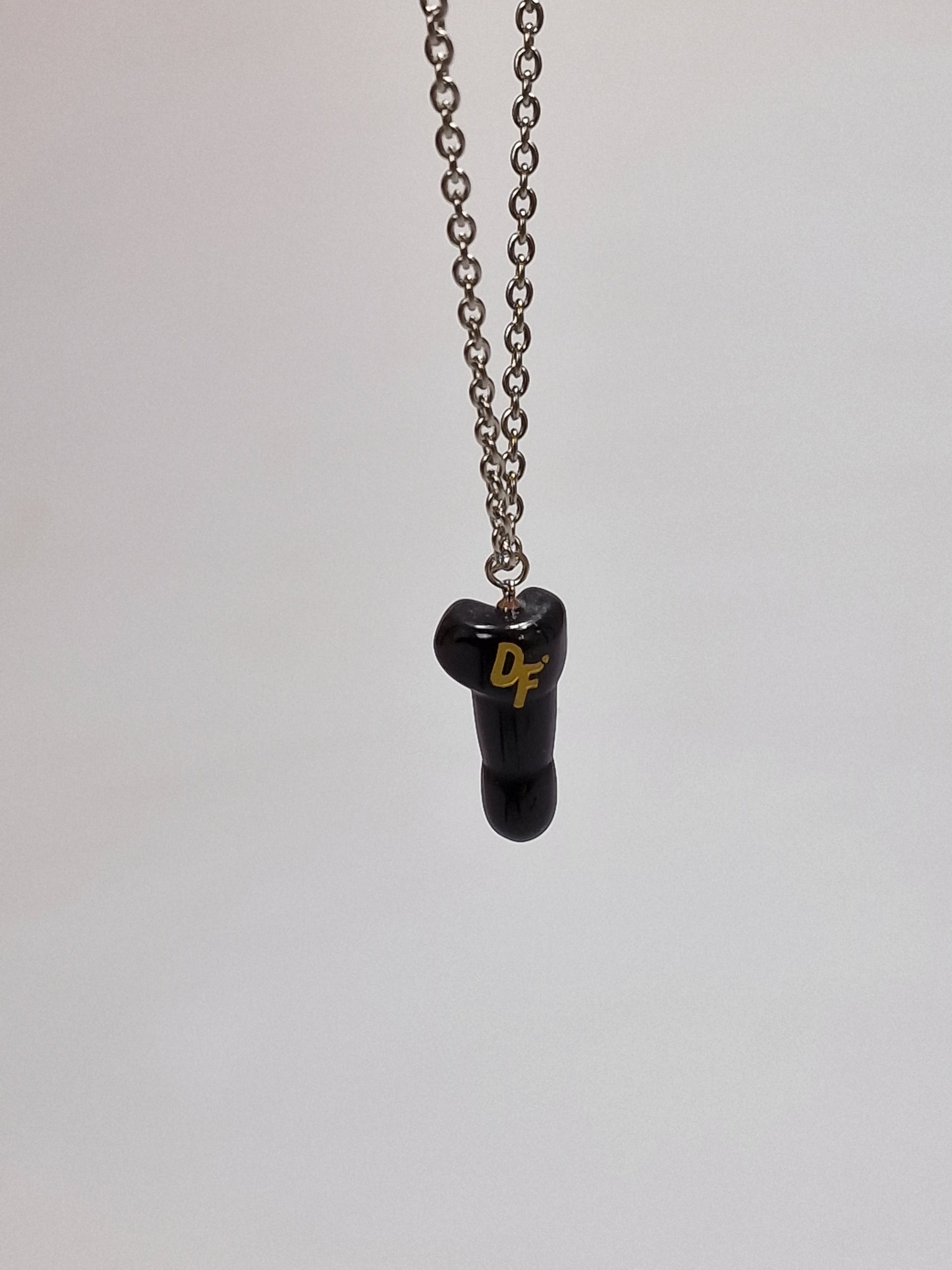 Un collar o collar divertido y único con un pene, polla o si así lo llamas, polla. El adorno está hecho de piedra o cristal de ónix negro o de ónix negro.