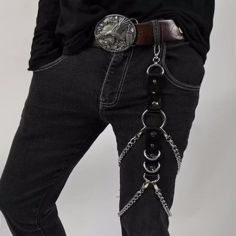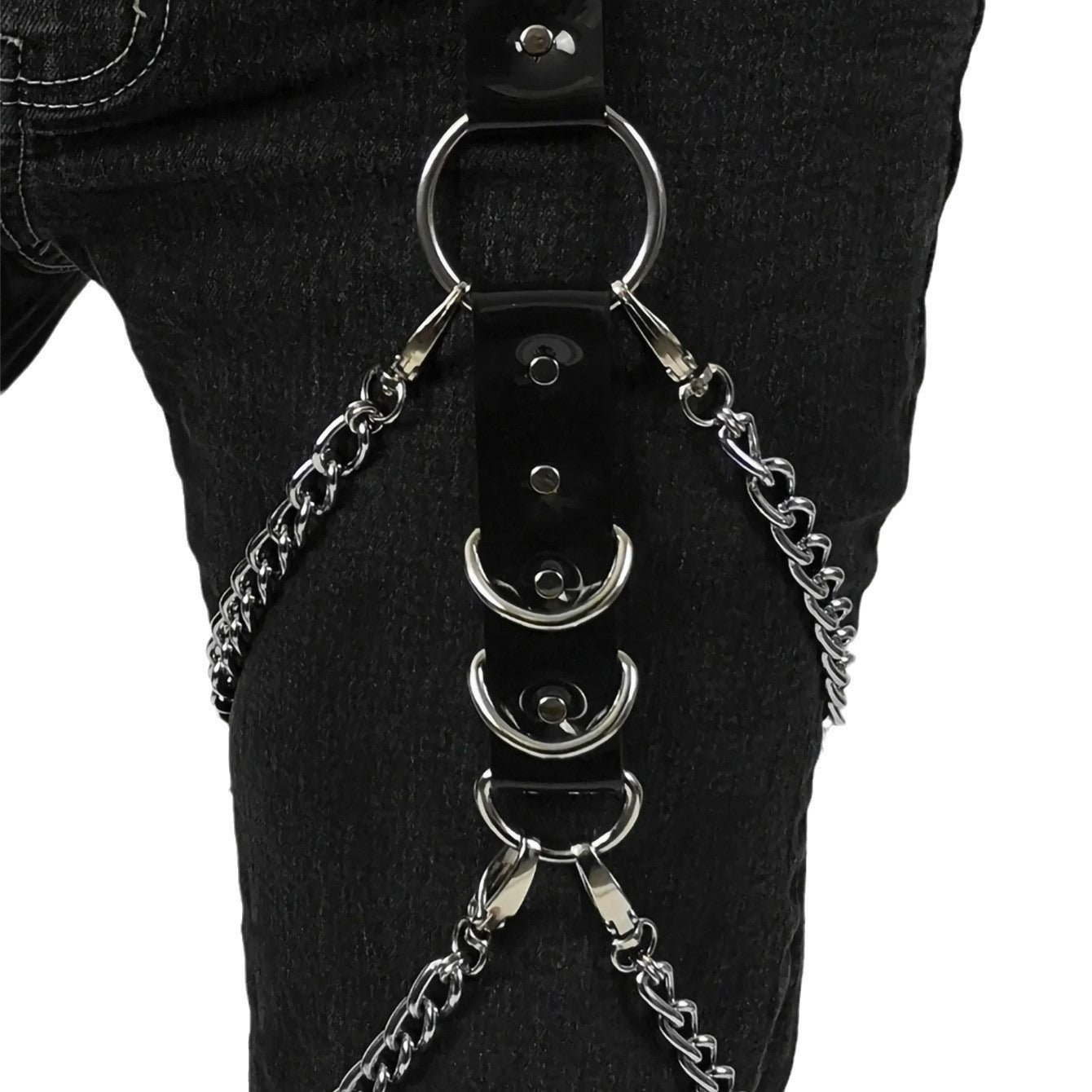 Un arnés único en cuero PU y cadenas. Este arnés para pierna tiene varios anillos y cadenas que se sujetan alrededor del muslo. Un arnés realmente cómodo, un accesorio que queda bien para hombres, chicos y, por supuesto, también funciona como arnés para mujer. Un arnés sexy que es perfecto para fiestas fetiche, los clubes más divertidos o si vas a una fiesta slm o dekadance. Accesorio perfecto para la discoteca, la fiesta de Halloween o la fiesta fetiche. Un traje steampunk o gótico.
