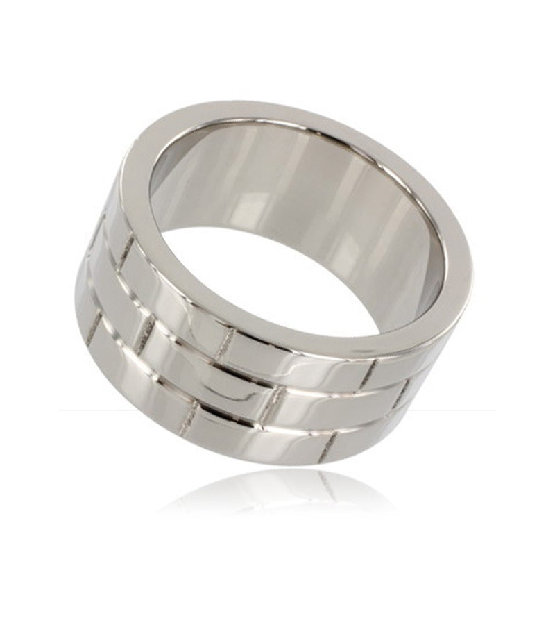 Este anillo para pene muy ancho y grueso está hecho de acero quirúrgico sin níquel con un patrón, lo que lo hace inusual y único para ti. El acero quirúrgico sin níquel hace que este anillo metálico sea seguro y no cause ardor ni picazón, y al ser de acero te proporcionará una erección firme como una piedra. Este es un anillo para pene de tipo lujoso, disponible en cuatro tamaños, con diámetros interiores de 40, 45, 50 y 55 mm, y un grosor/ancho del anillo de 2,7 cm. El peso de este anillo ancho es de 155 a 210 gramos, dependiendo del tamaño, por lo que tendrás un peso agradable alrededor de tus joyas.