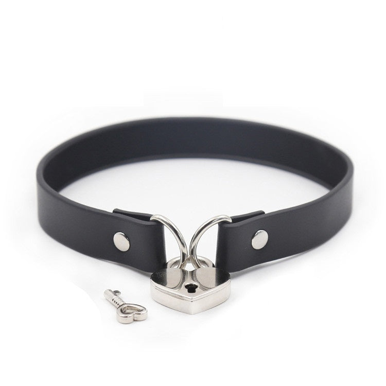 Collar o choker elegante de cuero con un candado en forma de corazón. Disponible en negro o rosa.
