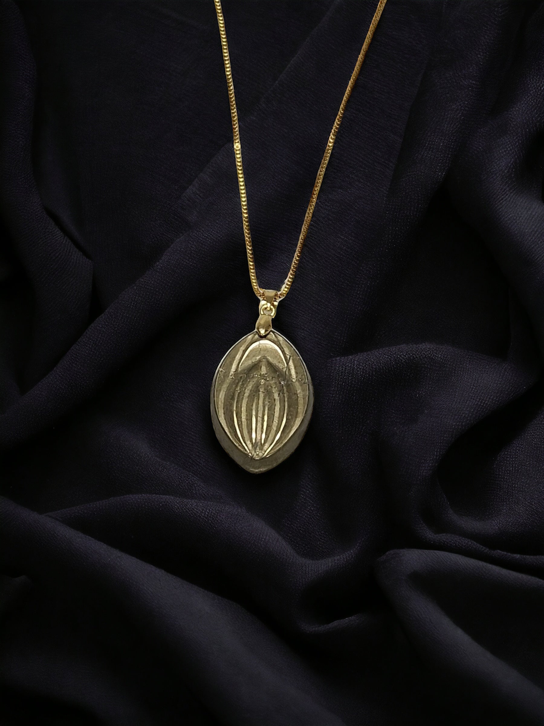 Un hermoso collar con un cristal de la piedra pirita, con forma de vagina o fifi.