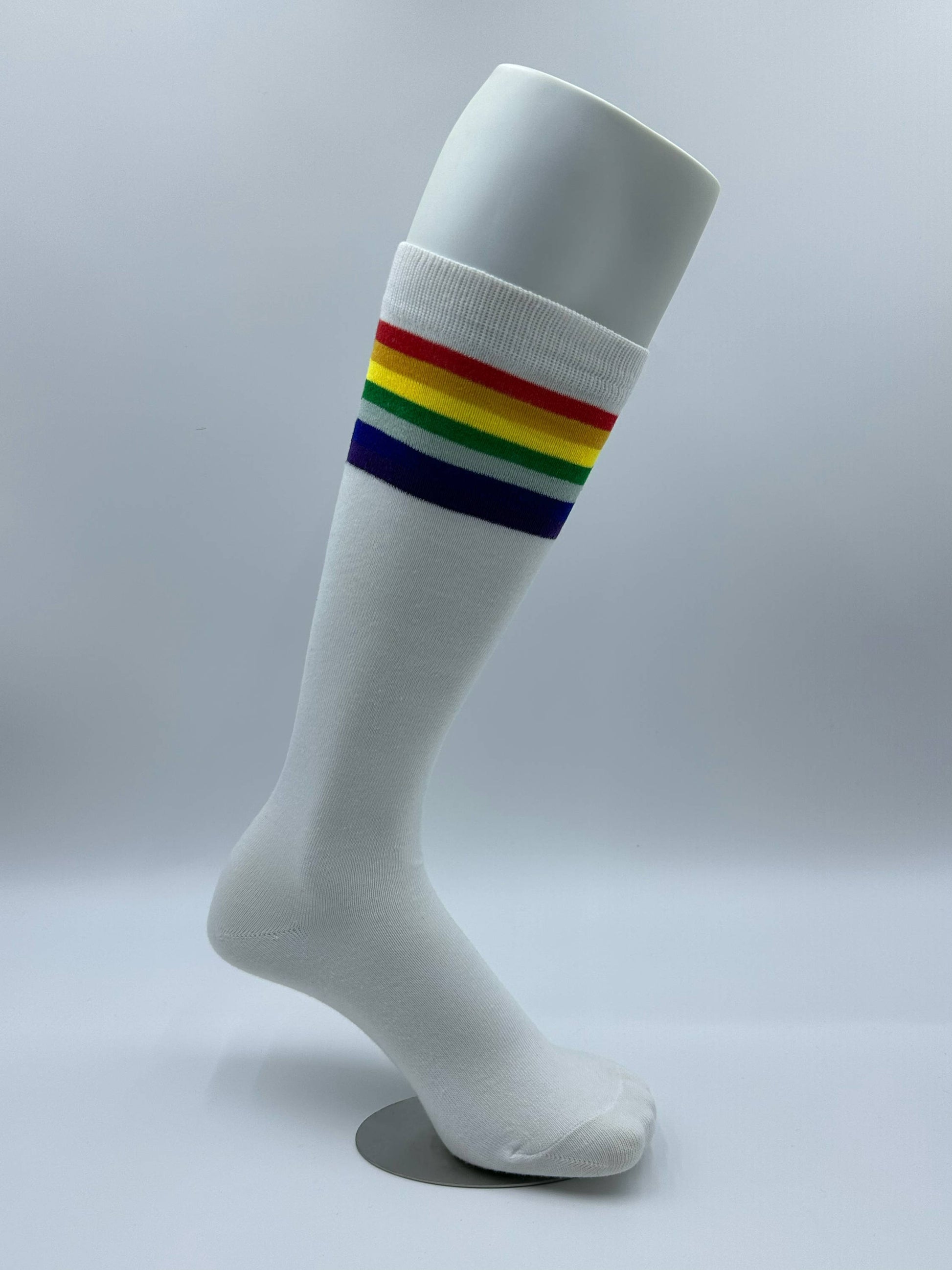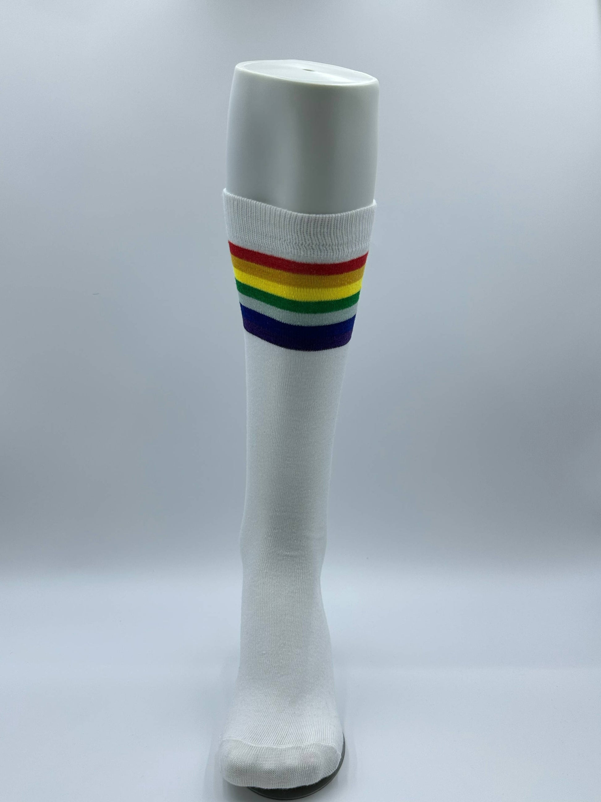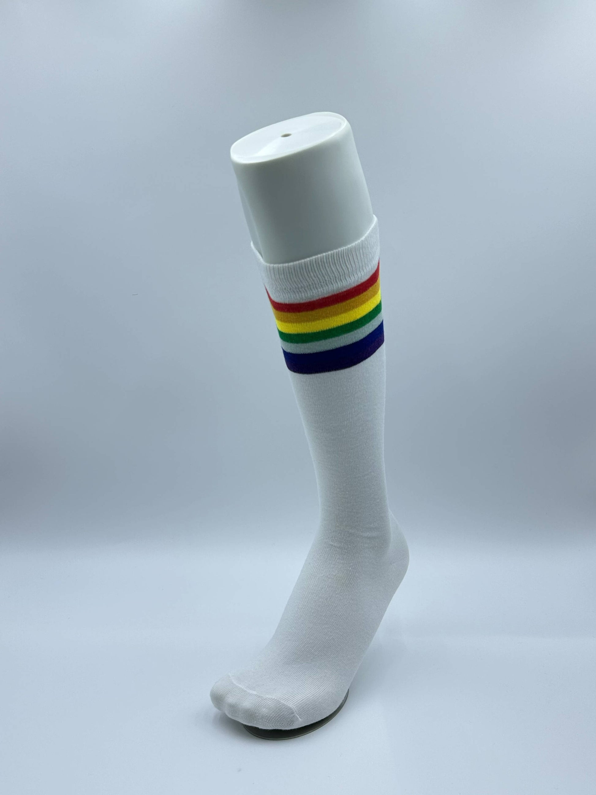 Fotbollsstrumpor eller höga knästrumpor, vita med regnbågs färgade streck. Snygga och billiga pridefärgade höga strumpor i hög kvalité.