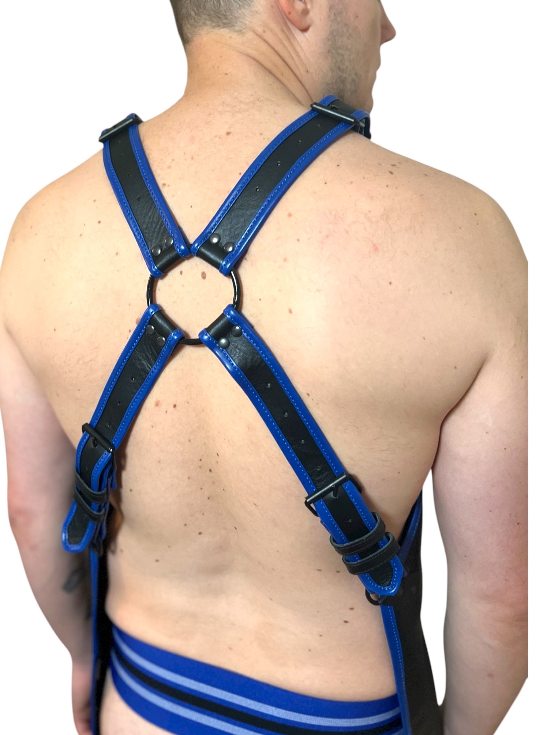 Ett helt unikt förkläde i äkta läder eller skinn. Detta fetish plagg är handgjort och sys av våra skräddare eller körsnärer. Det har en praktisk ficka på bröstet, lagom stor för din mobil, betalkort och kanske en flaska poppers. Detta fetish förkläde har blå stripes eller kanter runt om. Svart och blått som signalfärg för de som använder gay signalfärger.