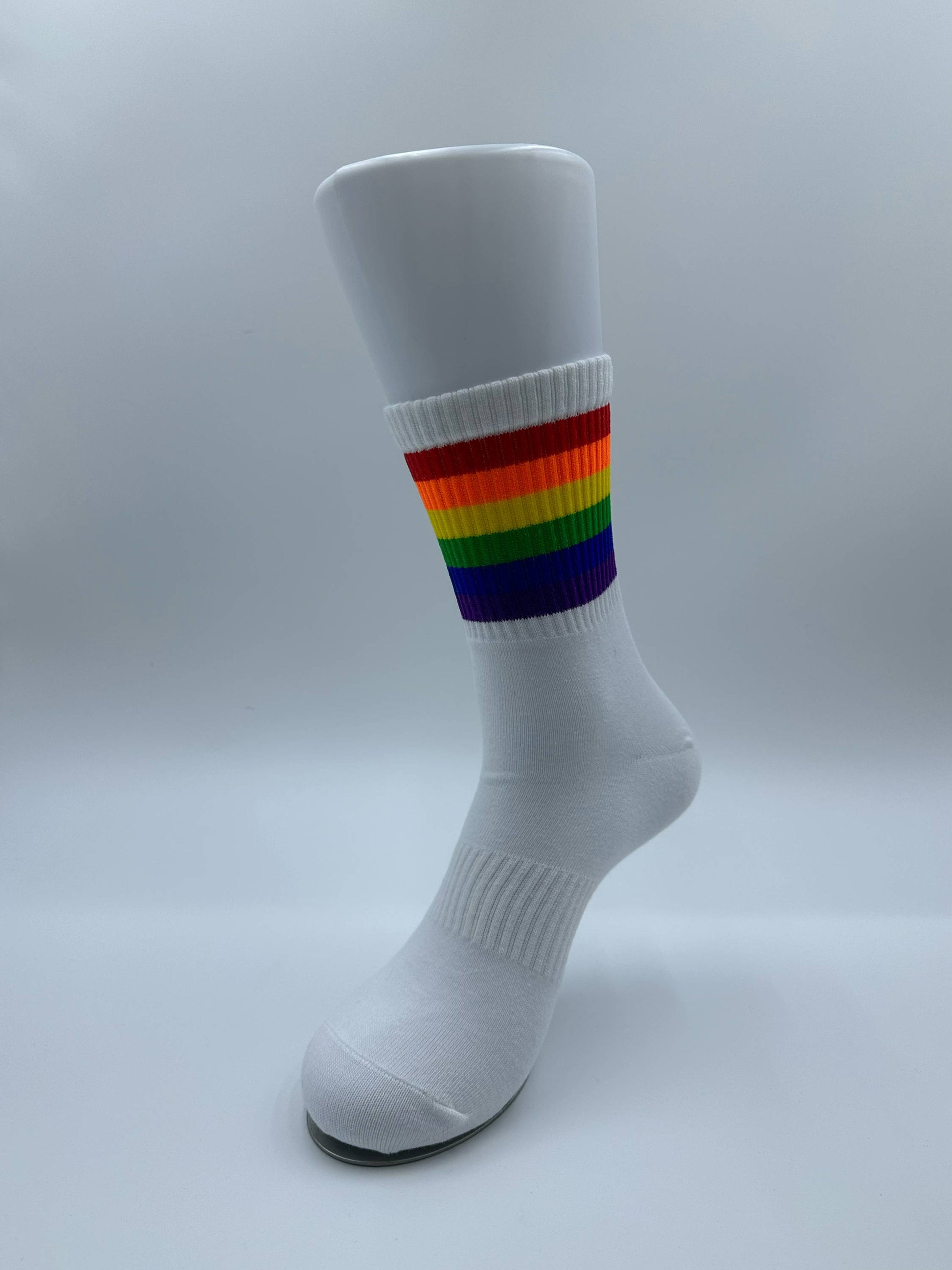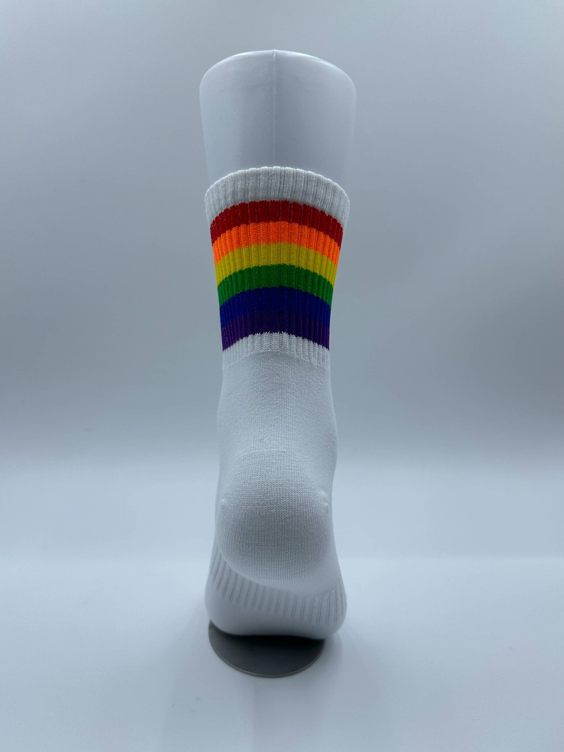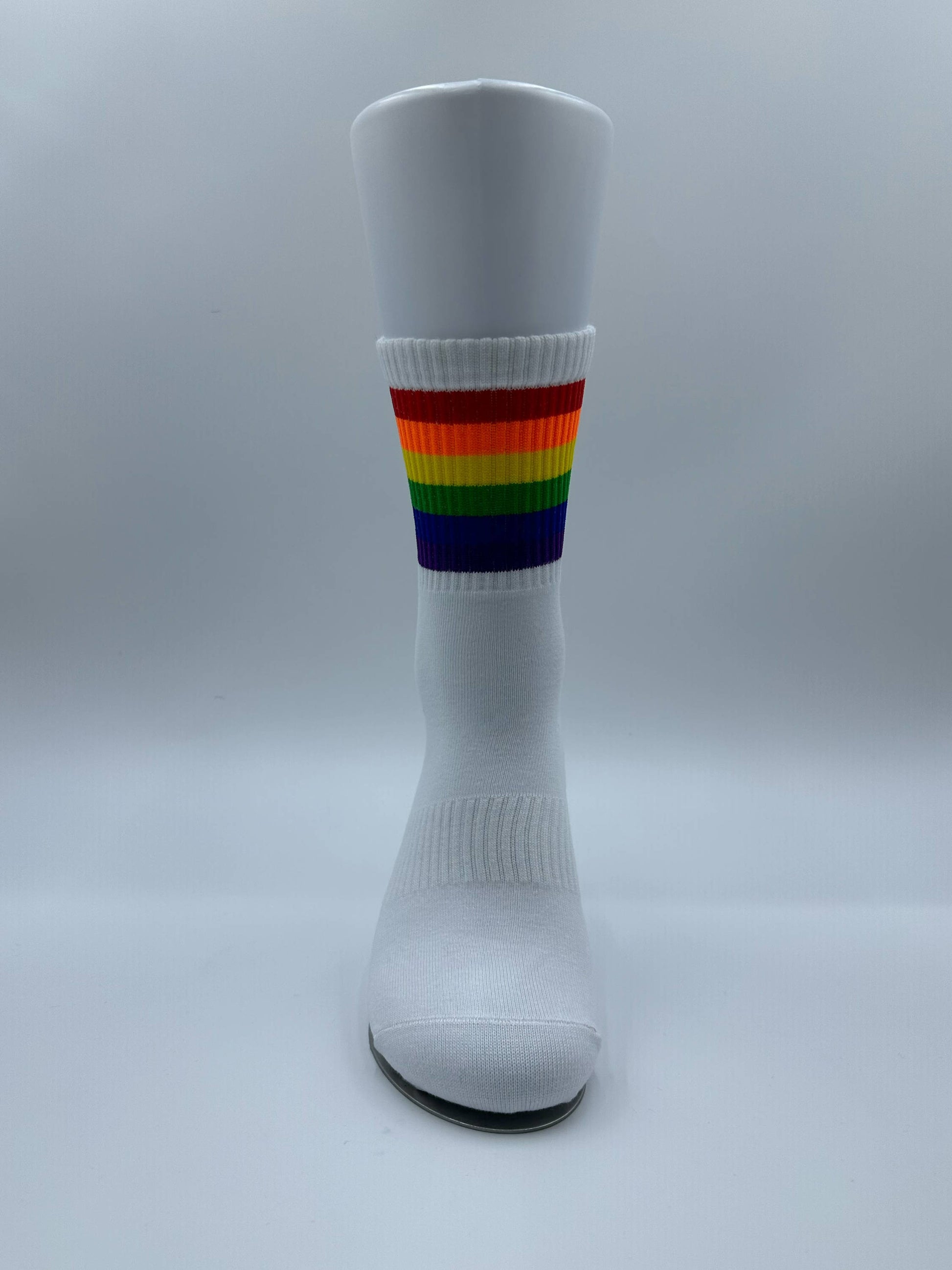 Crew strumpor, vita med regnbågs färgade streck. Pridefärgade strumpor. Bra träningsstrumpor eller fotbollsstrumpor. Bra och billiga bomullsstrumpor med hög kvalité