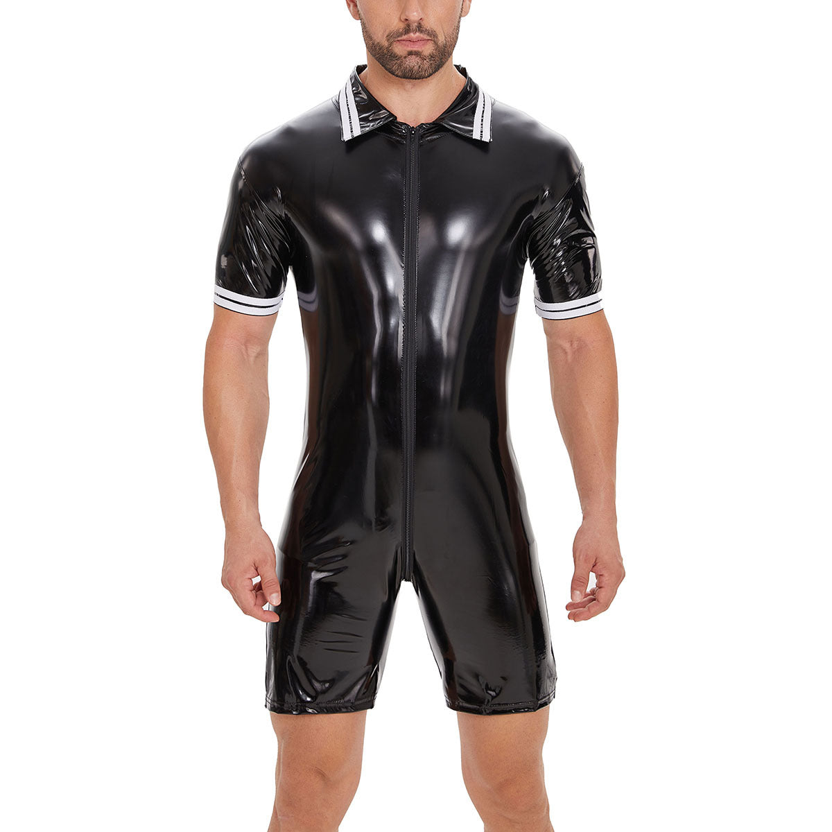 En snygg och sexig jumpsuit i mjukt och skönt blankt gummi med vita streck på kragen och ärmarna. Denna modell av heldräkt är enklare att ta på och av då den är stretch och har en dragkedja. Denna jumpsuit i svart blankt gummi, nästan lack, är ett fantastiskt fetish plagg. Eftersom den är i gummi och av lite glansigt material, så visar den mycket av din kropp. Ett annorlunda och riktigt sexigt plagg för de roligaste festerna eller om du bara vill leka hemma med din partner.