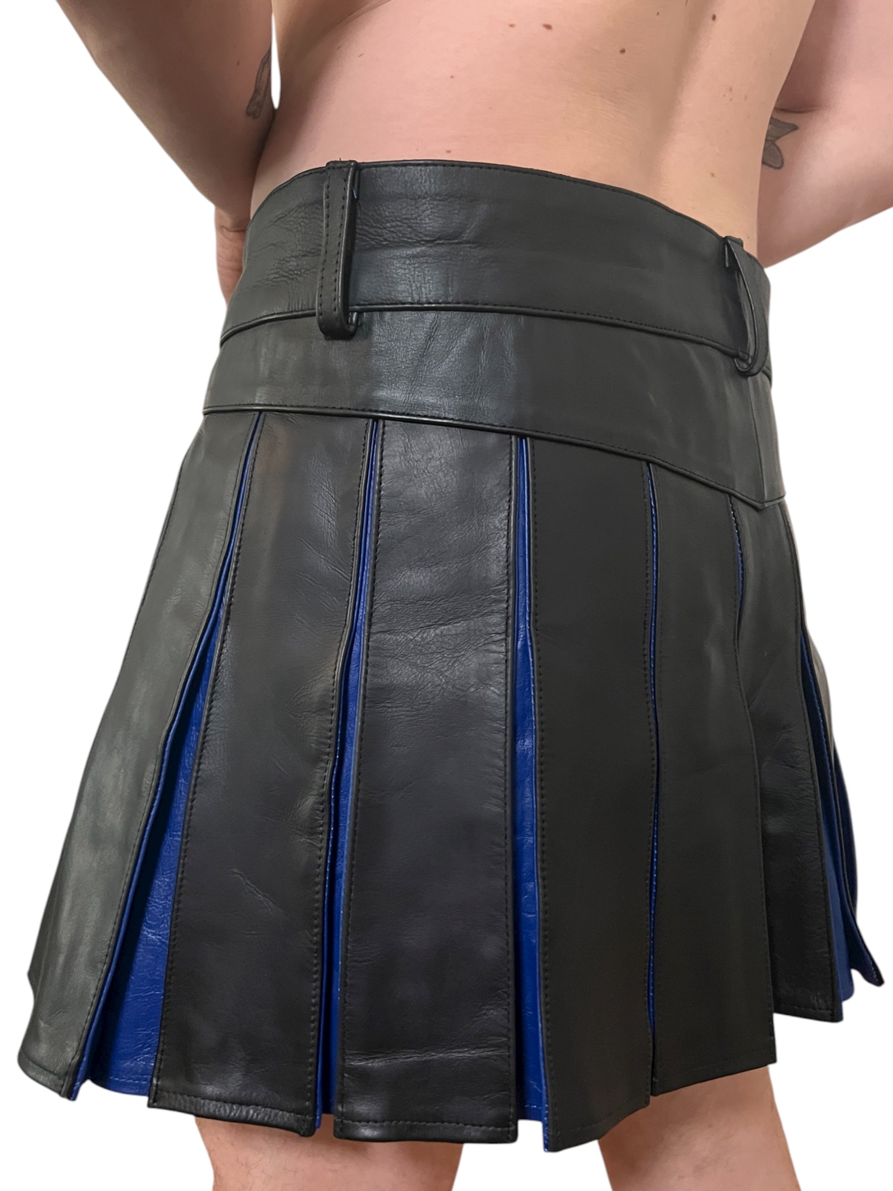 En helt unik kilt i äkta läder eller skinn. Detta fetish plagg är handgjort och sys av våra skräddare eller körsnärer. Detta förkläde är svart och blått. Den finns i två storlekar, XS/S/M och L/XL/XXL