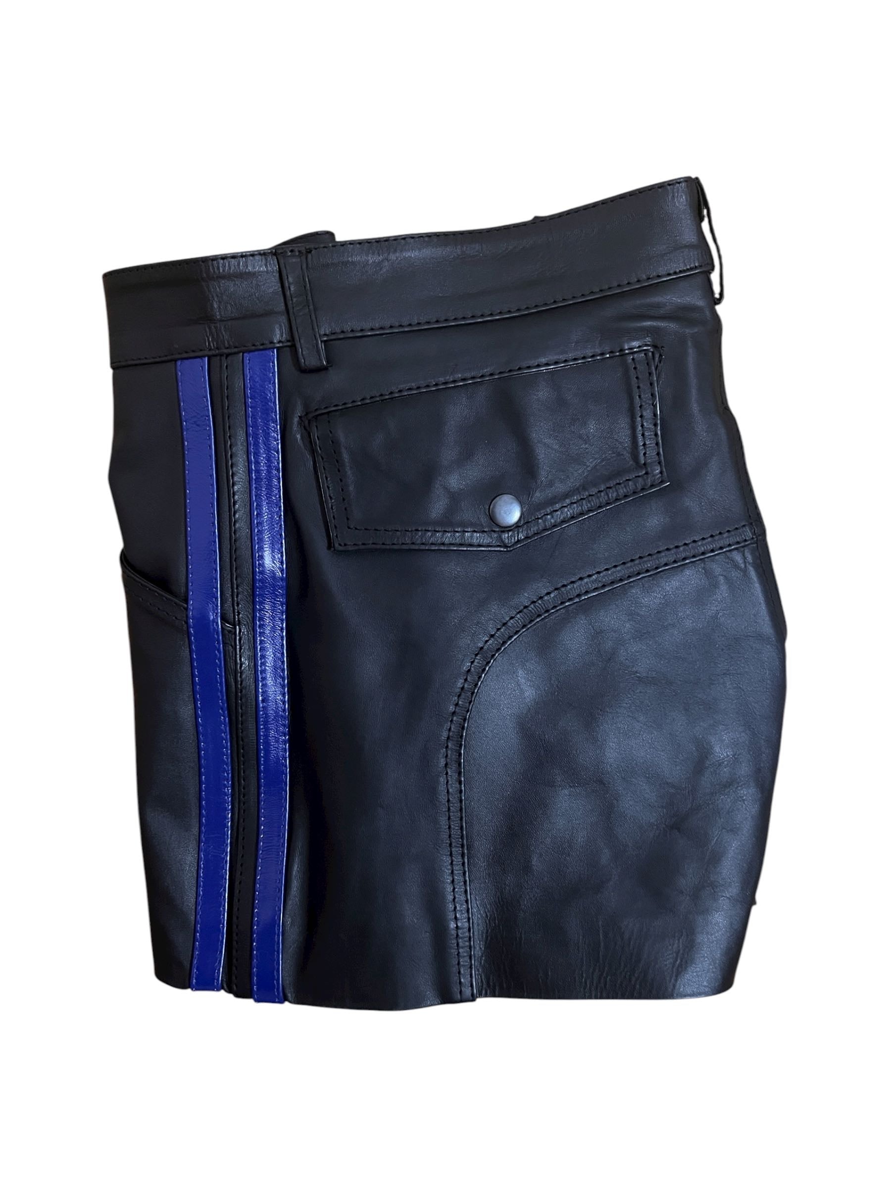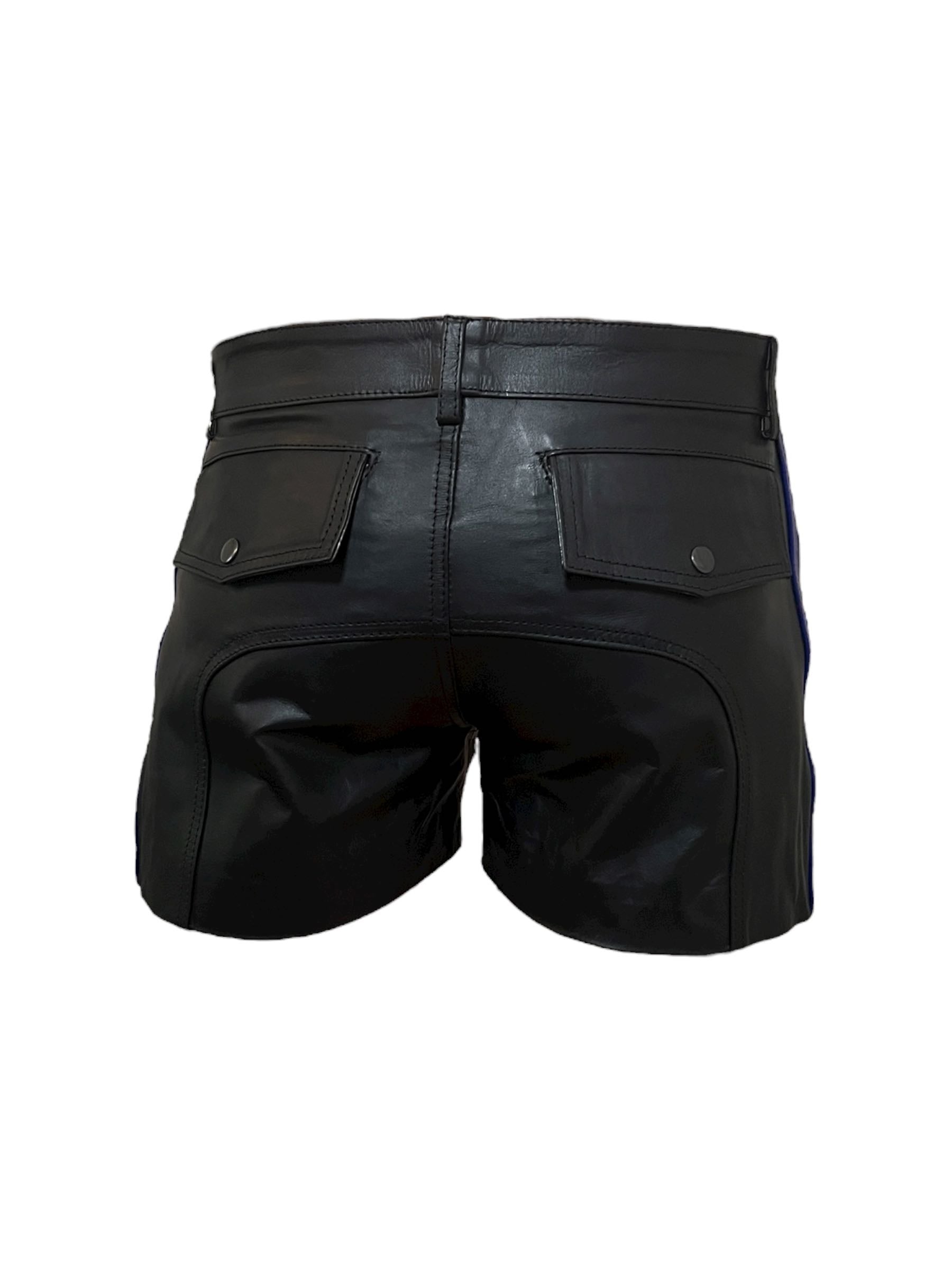 Shorts i riktigt läder, svarta skinnshorts med blå revärer, BDSM och gay